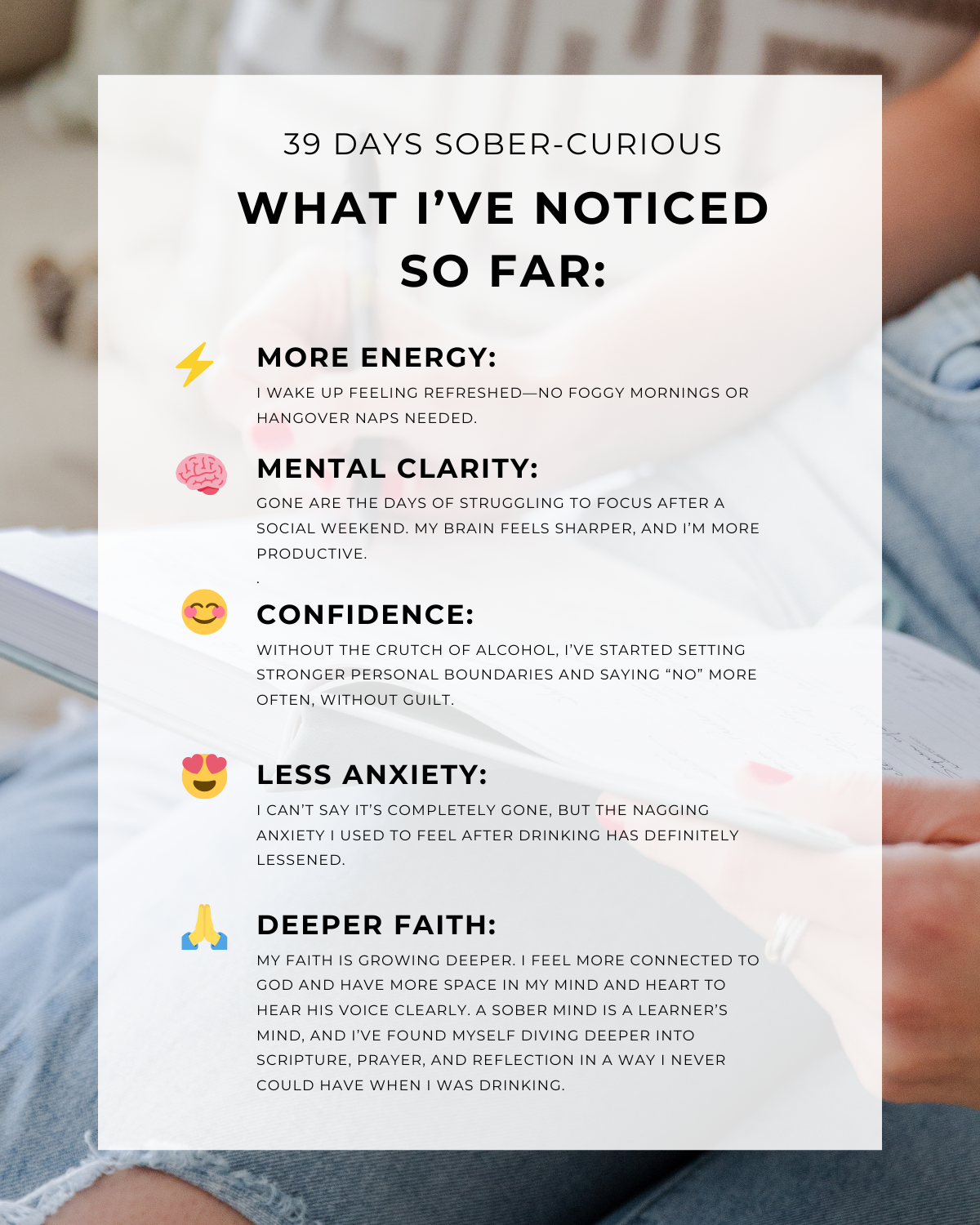 As I sat at the close of 2024, writing up my goals for the new year, I felt this overwhelming nudge, almost like a quiet whisper in my spirit. It was like God spoke to me and said, “This is what you need to do.” I can’t fully explain it, but I knew that 2025 needed to be the year I went 365 days without alcohol. It was more than just a resolution — it felt like a calling. And with that feeling in my heart, I made the decision to embrace sobriety for one whole year. So here I am, 39 days sober-curious (for you math people, yes — I started early), and already noticing some pretty significant changes.